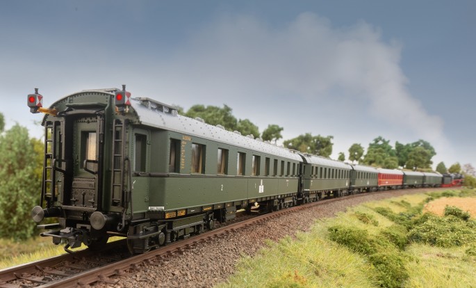 Natürlich bietet Märklin/TRIX auch ein passendes Wagenset zur 01.10 an. Die ebenfalls neu konstruierten Einheitsreisezugwagen der Bauart 1928 bis 1930 ergänzen diese Lok perfekt. Sowohl in der Wahl des jeweiligen Vorbildes als auch in der Detaillierung passen diese Wagen exakt zur Lokomotive. Das 6-teilige Wagenset stellt einen Schnellzug aus der Zeit der frühen 1950er Jahre dar, wie z. B. zwischen Mönchengladbach und Leipzig verkehrte.